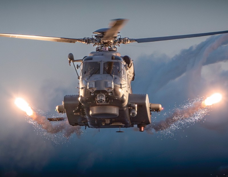 HMCS Charlottetown’s embarked CH-148 Cyclone helicopter “OSPREY” performs a flare countermeasure shoot during flight operations in the Mediterranean Sea while deployed on Operation REASSURANCE on August 19, 2024.