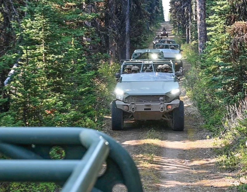 Un convoi de véhicules tactiques légers et de VTT effectuant une patrouille à Kananaskis, Alberta, en soutien à l’opération CADENCE le 8 juin 2025.