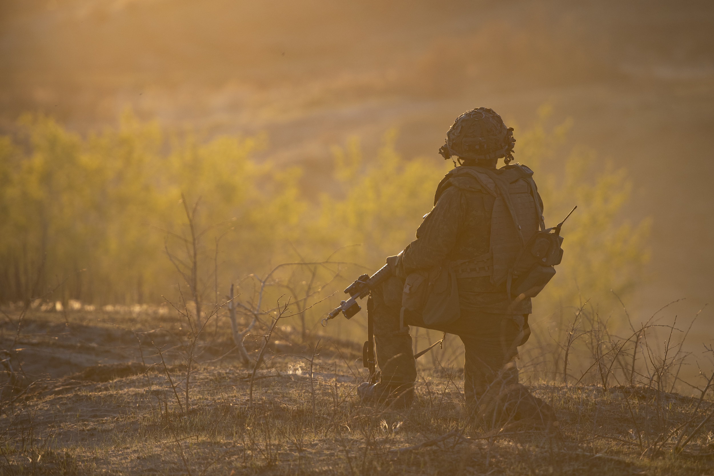 A soldier of the 2nd Battalion, Princess Patricia’s Canadian Light Infantry, acts as the enemy force, before the final firefight during Exercise MAPLE RESOLVE in the 3rd Canadian Division Support Base Detachment Wainwright, Alberta on May 10, 2021