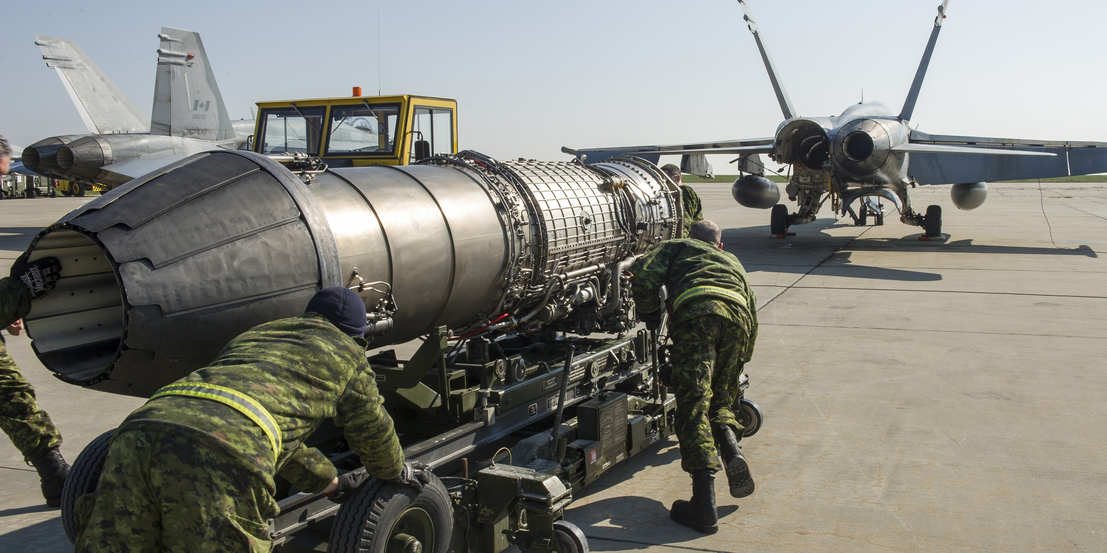 Technicians from Air Task Force-Romania change one engine on a CF-188 Hornet in Constanta, Romania during Exercise RESILIENT RESOLVE on March 17, 2016