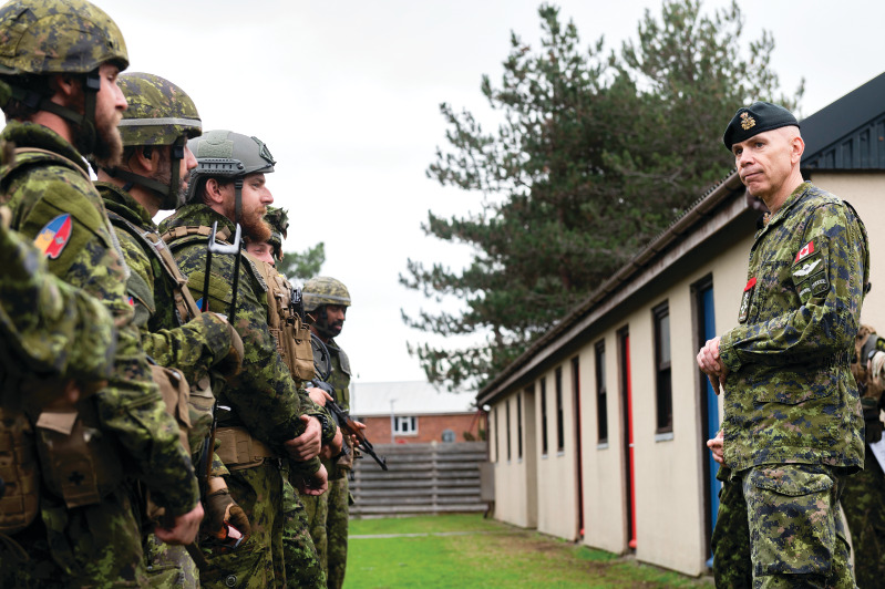The former Chief of Defence Staff (CDS) General Wayne Eyre, CMM, MSC, CD speaks with soldiers deployed on Operation UNIFIER-UK on October 28, 2022 in the United Kingdom.