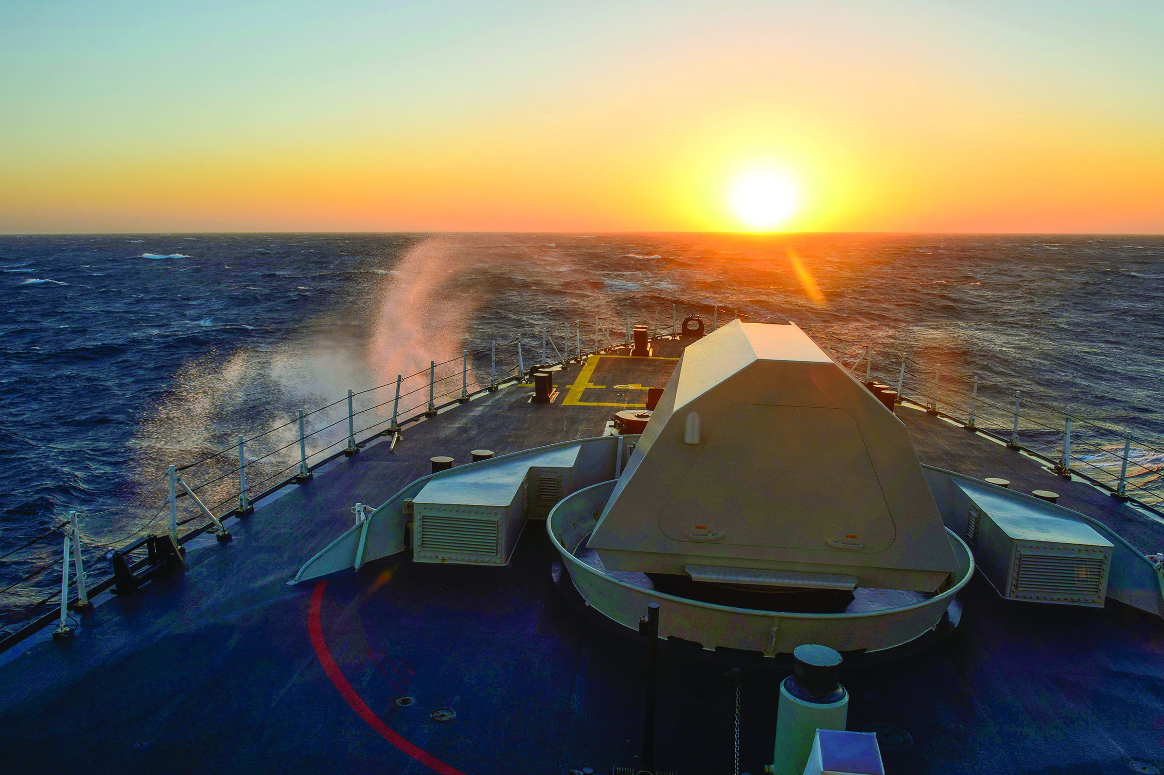 Her Majesty's Canadian Ship WINNIPEG sails into a sunrise in the Eastern Atlantic Ocean on the morning of November 8, 2015 during Operation REASSURANCE.