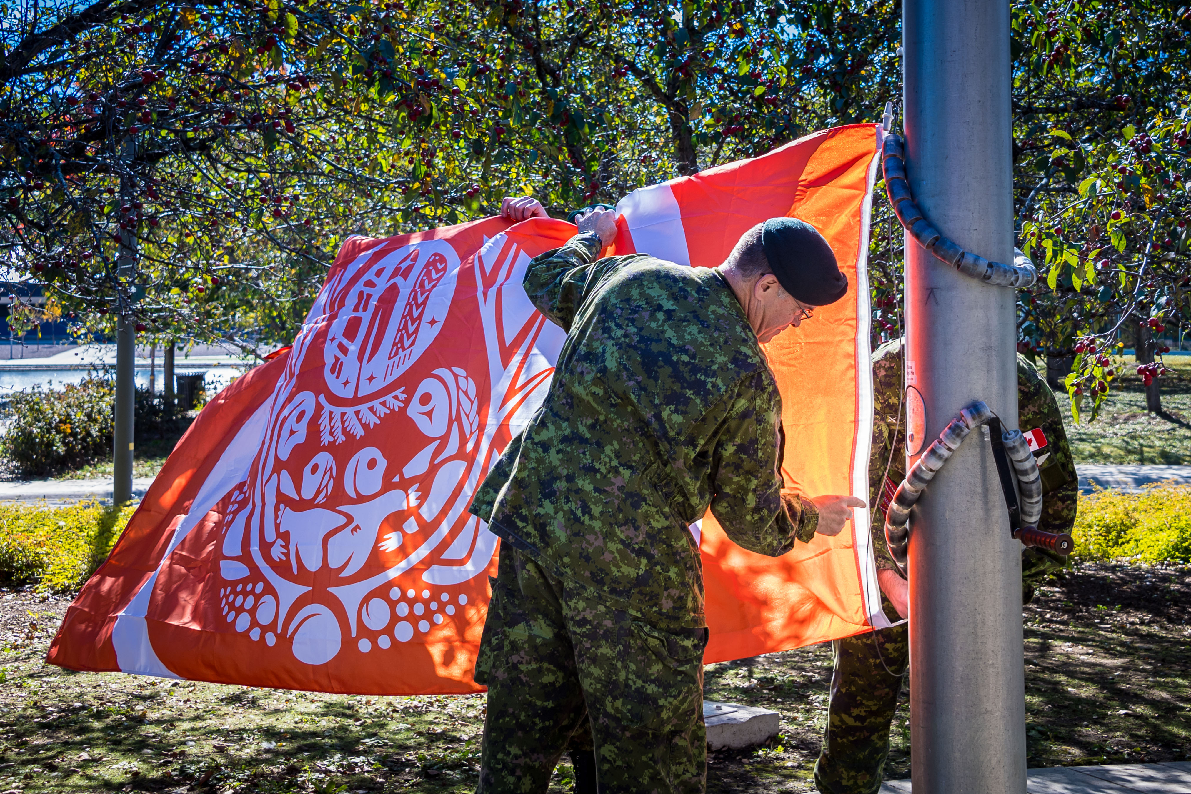 Commander Canadian Army and Defence Team Champion for Indigenous People, attaches the Survivor’s Flag, during a ceremony commemorating the National Day for Truth and Reconciliation held at Carling Campus in Ottawa, Ontario on September 29, 2022.