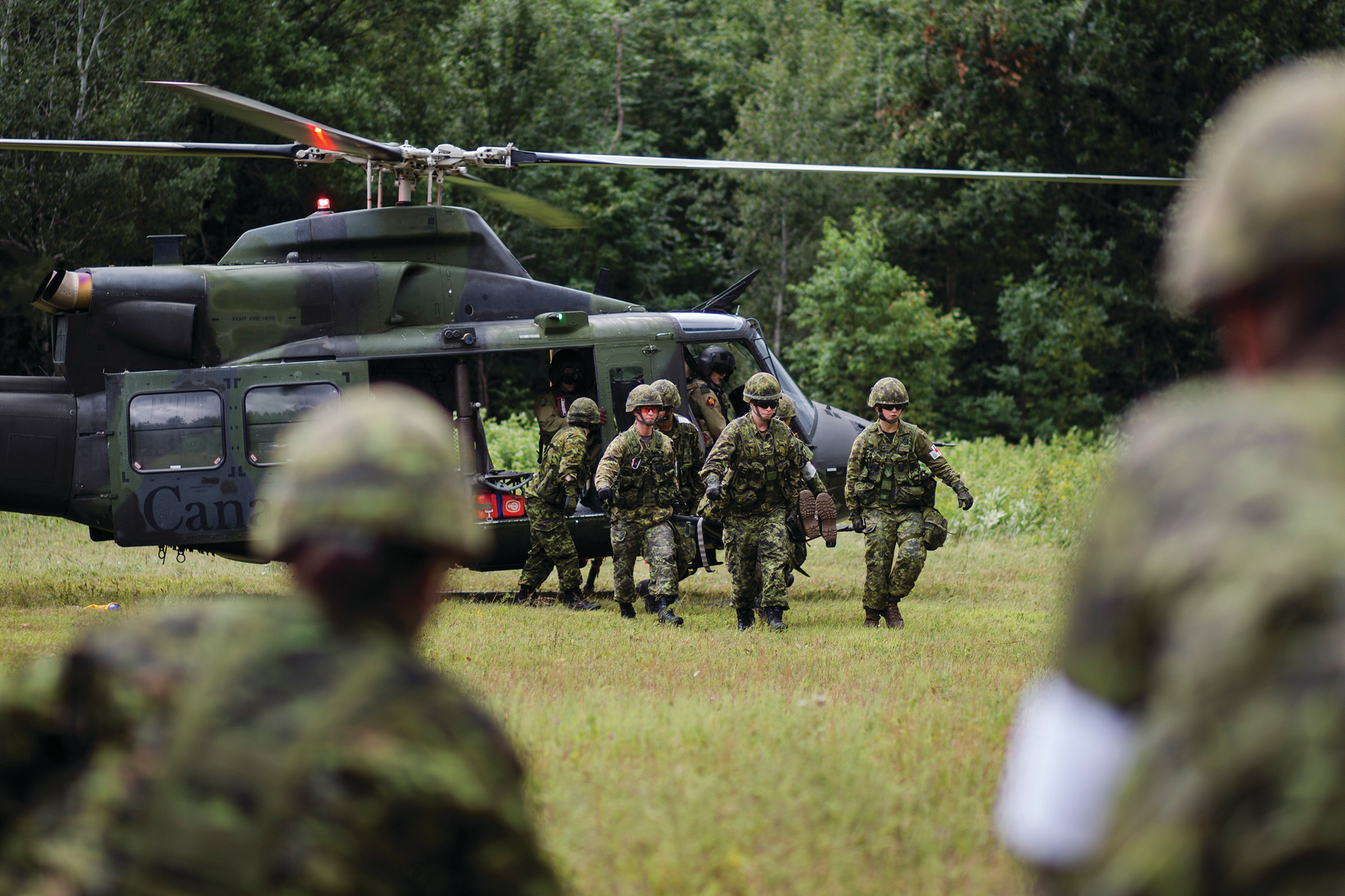 Canadian Army reservists from 4th Canadian Division medical units unload a simulated casualty from a CH-146 Griffon helicopter during Exercise STALWART GUARDIAN on August 21, 2015 at Garrison Petawawa, Ontario.