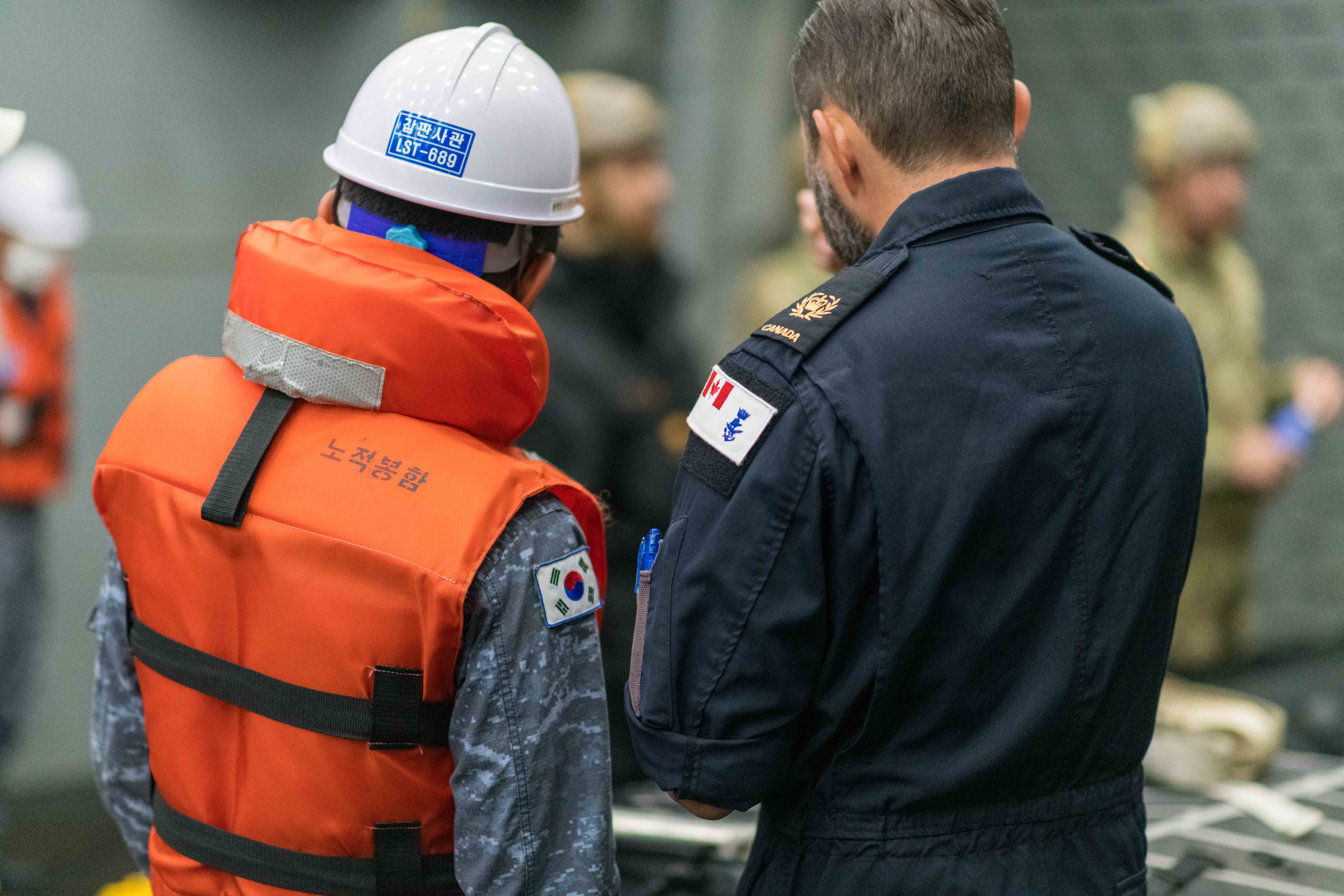 Chief Petty Officer Second (CPO2) Class speaks with a member of the Republic of Korea Navy during the Multinational Mine Warfare Exercise 22 (MNMIWEX 22) in the vicinity of Pohang, Republic of Korea on October 9, 2022.