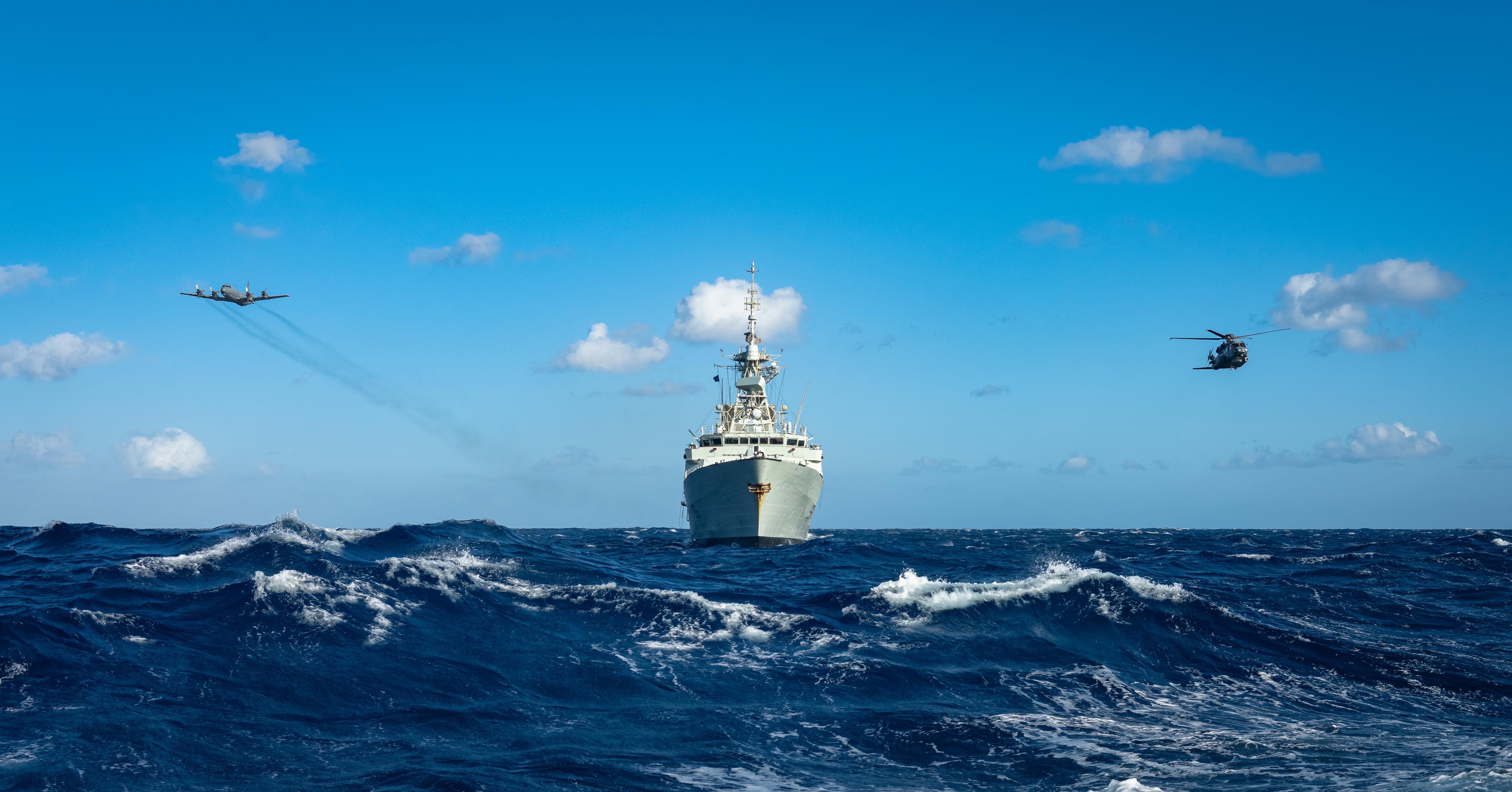 HMCS MONTREAL, its embarked CH-148 Cyclone helicopter, call sign Strider, and a CP-140 Aurora aircraft, call sign Demon 02, patrol the Mediterranean Sea to help build maritime situational awareness in associated support of NATO’s Operation SEA GUARDIAN on April 11, 2022.