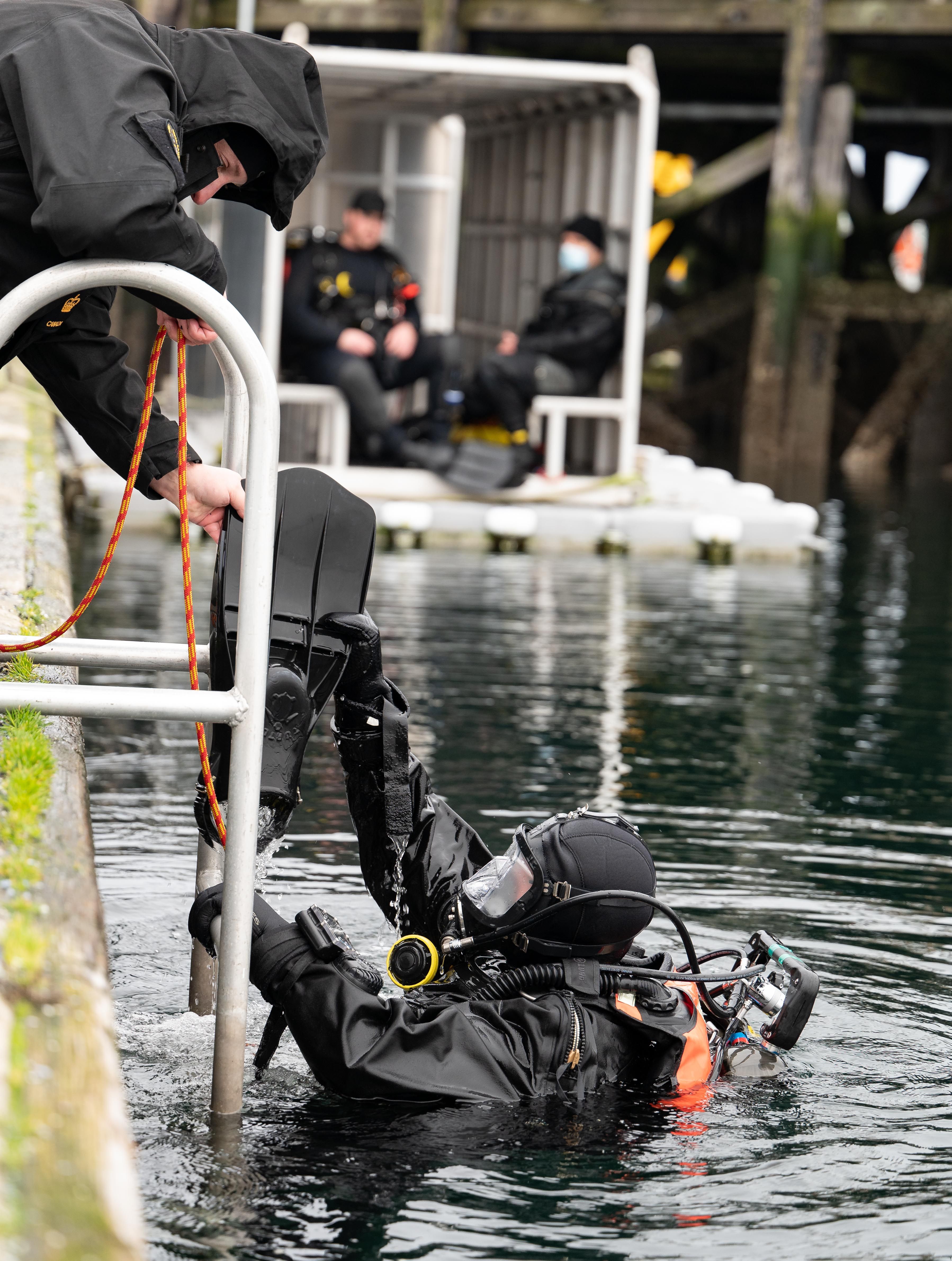 A Chief Petty Officer 2nd Class (CPO2) completes his first CABA (Compressed Air Breathing Apparatus) Lite dive during a Naval Reserve National Dive Exercise at the Royal Canadian Navy’s Cadet Training Center in Comox, British Columbia, January 27, 2022.