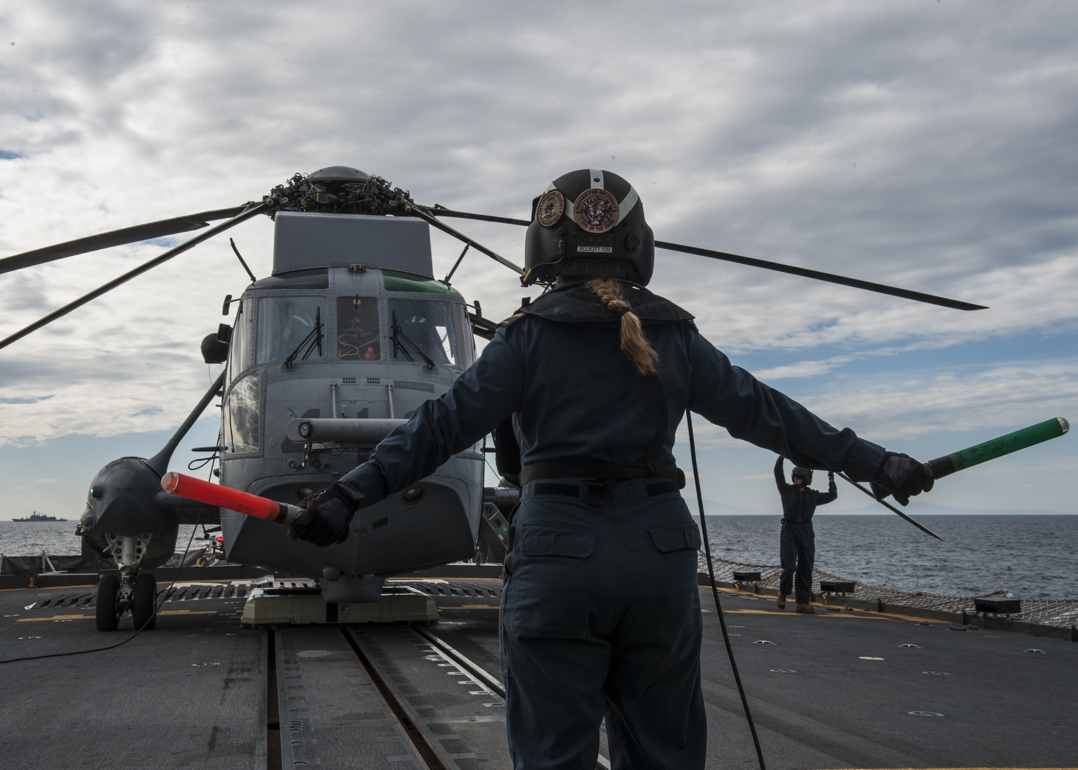 Her Majesty's Canadian Ship FREDERICTON's Air Detachment deck director signals the deck crew during the start-up of the embarked CH-124 Sea King helicopter on Operation REASSURANCE on March 3, 2015.