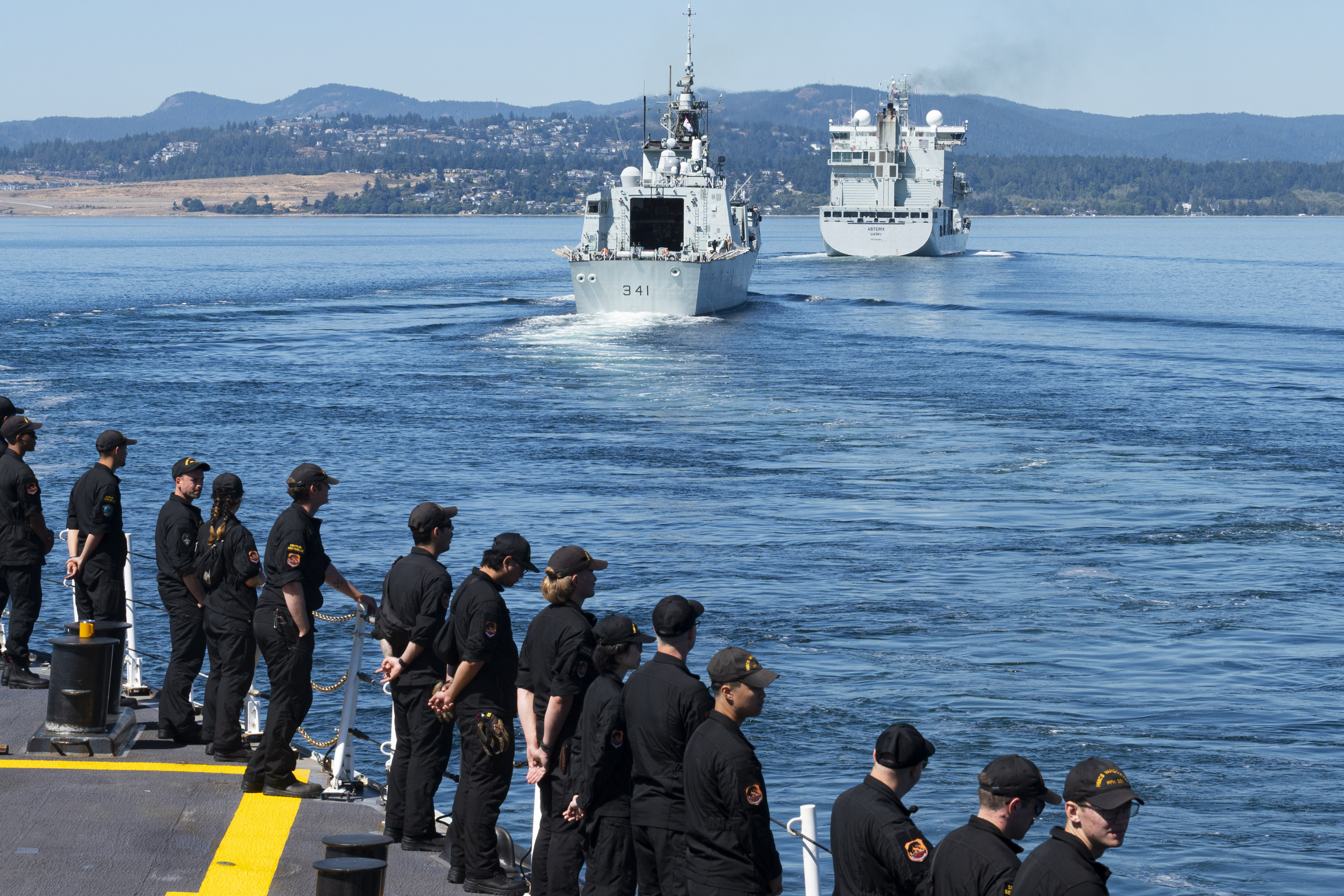 The Motor Vessel (MV) ASTERIX and His Majesty's Canadian Ship (HMCS) OTTAWA lead the way for HMCS VANCOUVER during a sail past of the Victoria shorelines after departing Canadian Forces Base Esquimalt, British Columbia, for the Indo-Pacific on August 14, 2023.