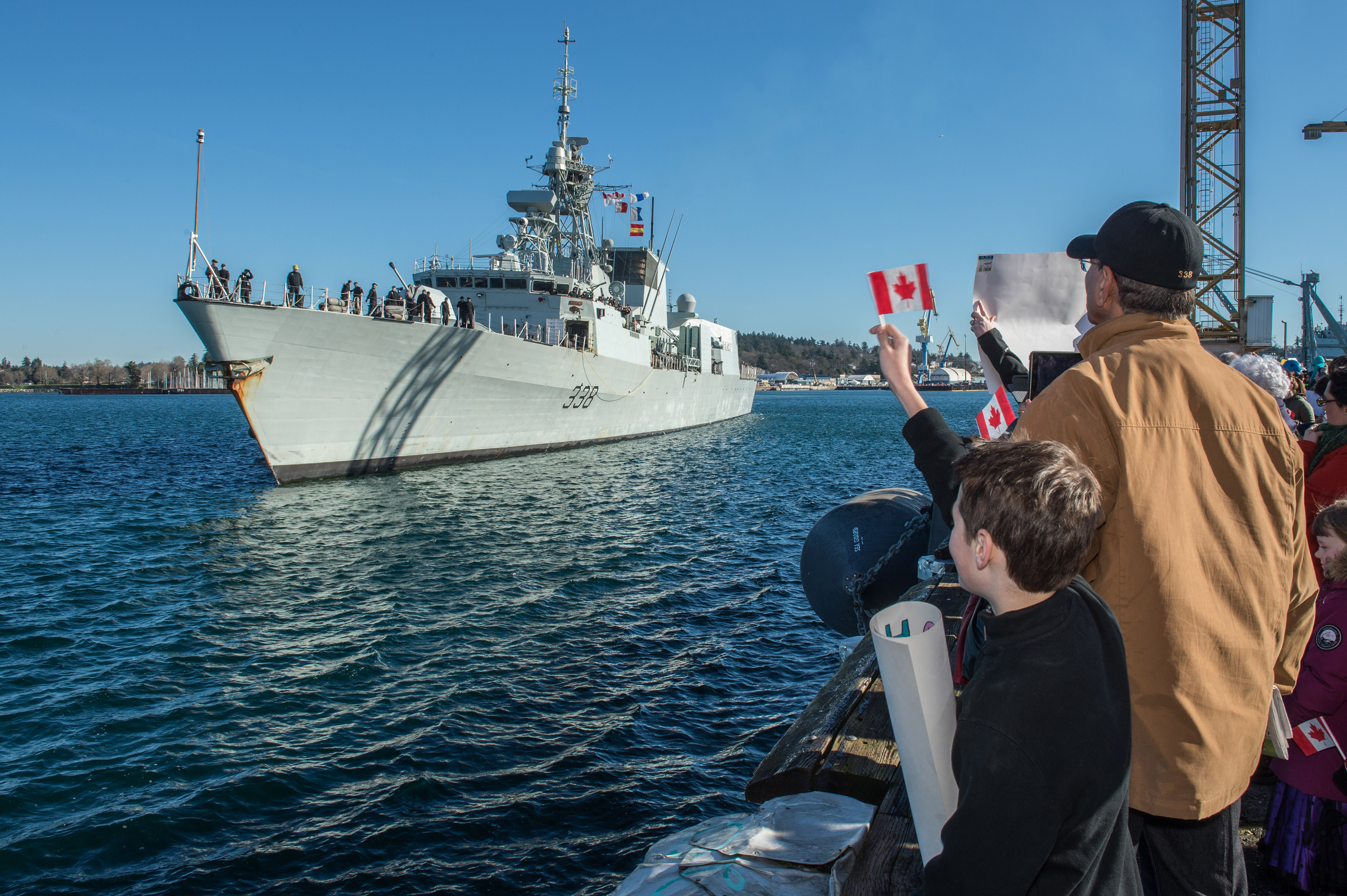 A child patiently waits for his loved one as he waves his Canadian flag during the arrival Her Majesty’s Canadian Ship (HMCS) WINNIPEG, who is returning home after an eight and a half month deployment to Canadian Forces Base (CFB) Esquimalt on February 23, 2016.