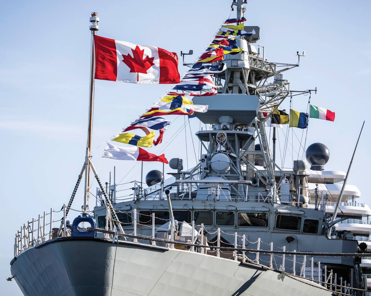 HMCS Charlottetown celebrates Spanish National Day while alongside ESPS Cantabria and ESPS Cristóbal Colón as the ships conduct a port visit in Catania, Italy, during Operation REASSURANCE on October 12, 2024.