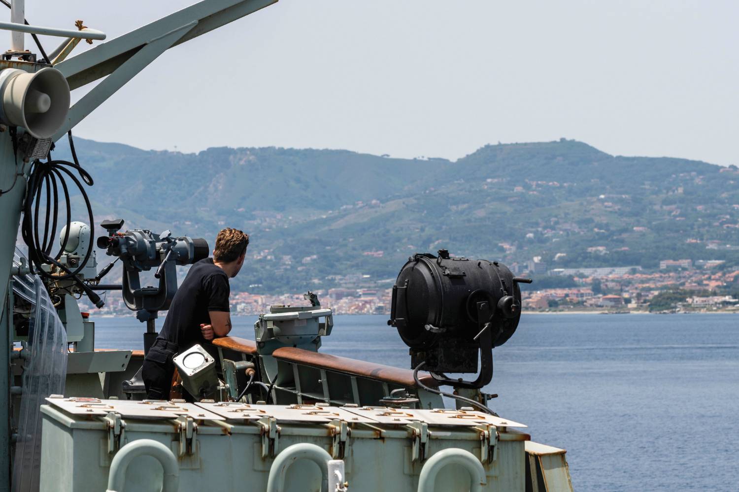 A sailor of HMCS FREDERICTON admires the coastline view of Italy as the ship sails through the Strait of Messina in the Mediterranean Sea during Operation REASSURANCE on June 23, 2023.