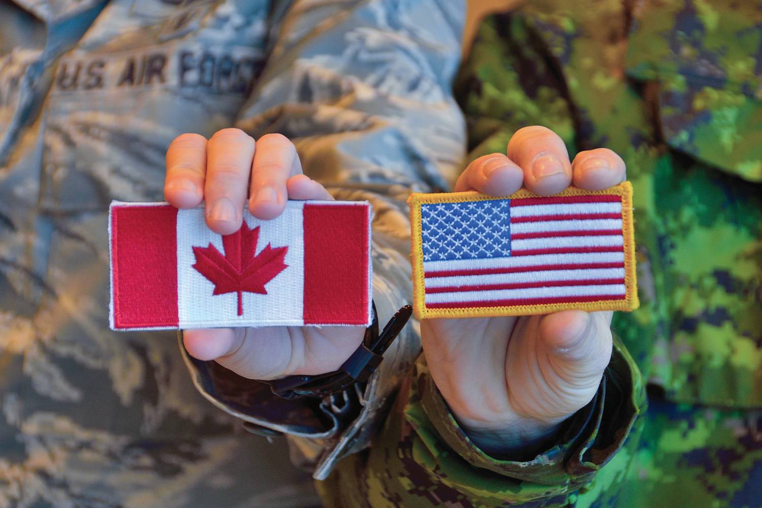 Canadian and American military members exchange their flags at 5 Wing Goose Bay, Newfoundland and Labrador during Exercise VIGILANT SHIELD 17 on October 17, 2016.