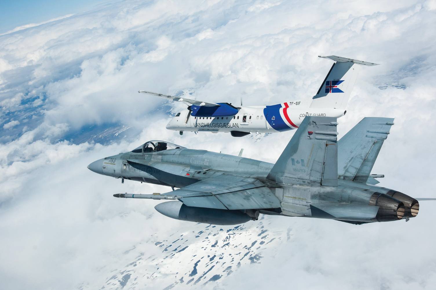 A Royal Canadian Air Force CF-188 Hornet fighter from 433 Tactical Fighter Squadron and an Icelandic Coast Guard Dash-8 patrol aircraft fly over Iceland on May 31, 2017 during an Operation REASSURANCE interception exercise.