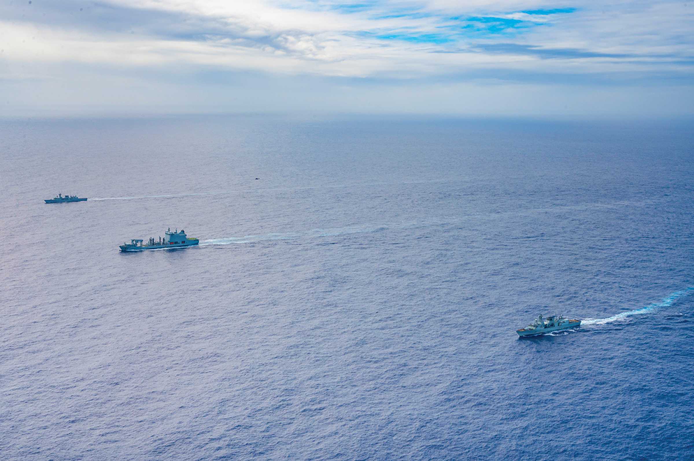 (From front to back) His Majesty’s Canadian Ship (HMCS) Vancouver, Motor Vessel (MV) Asterix and HMCS Ottawa conduct a PHOTOEX in the Pacific Ocean on December 1, 2023.