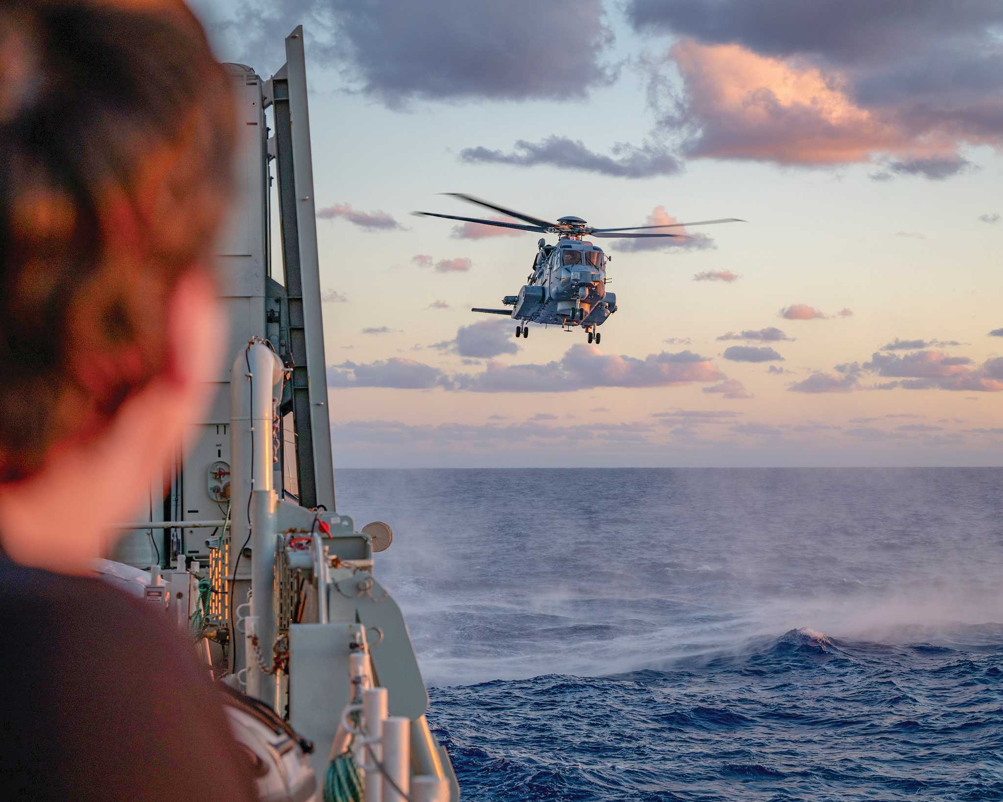Sailor watching BLACKHORSE a CH-148 Cyclone Helicopter flight away from HMCS St. John’s during OP REASSURANCE, on October 9, 2025.