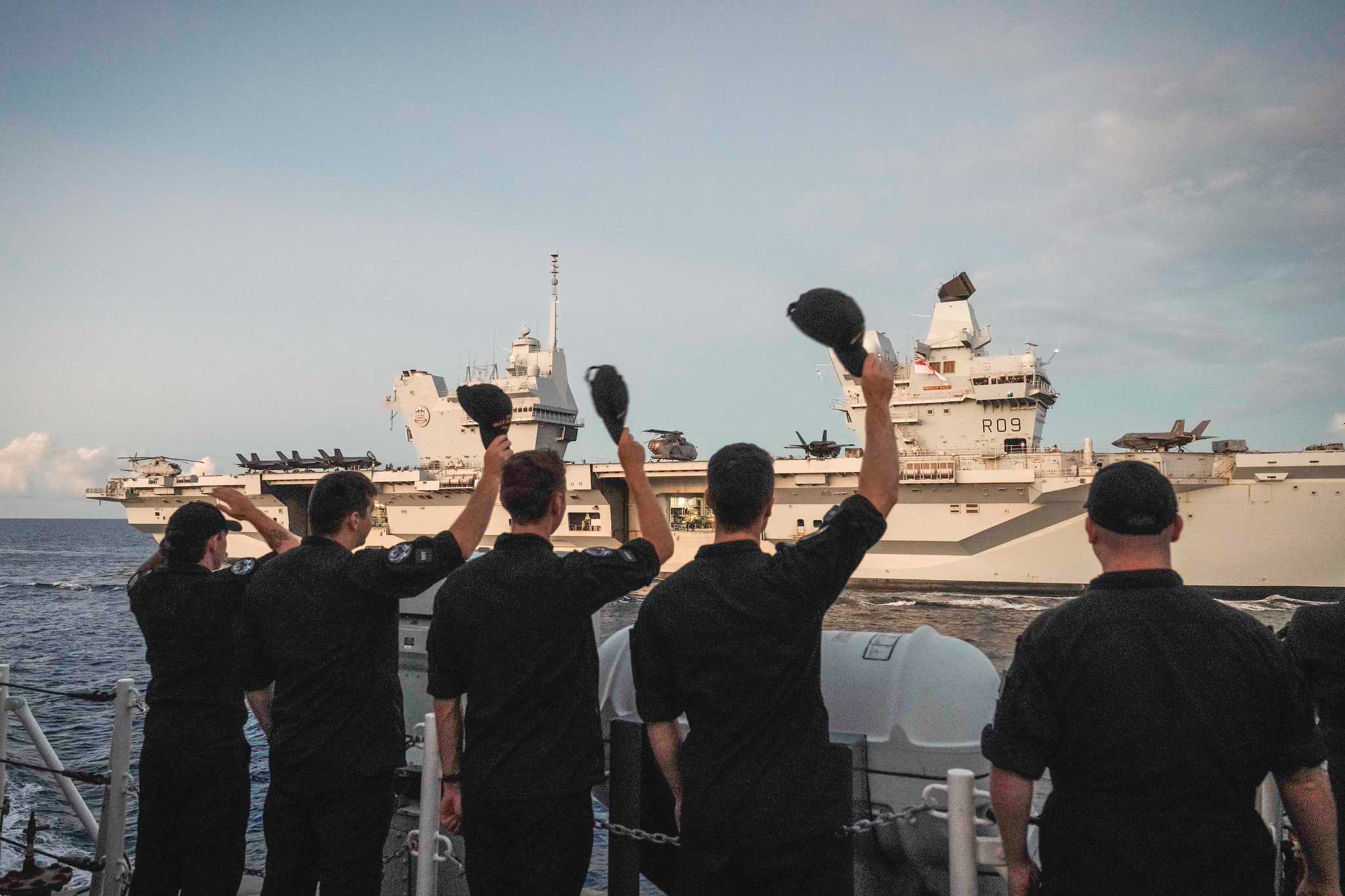 Members of HMCS Ville de Québec wave goodbye to HMS Prince of Wales as the ships conduct a PassEx, before HMCS Ville de Québec departs the UK-led Carrier Strike Group, during Op HORIZON, in the Sea of Japan, on September 12, 2025.