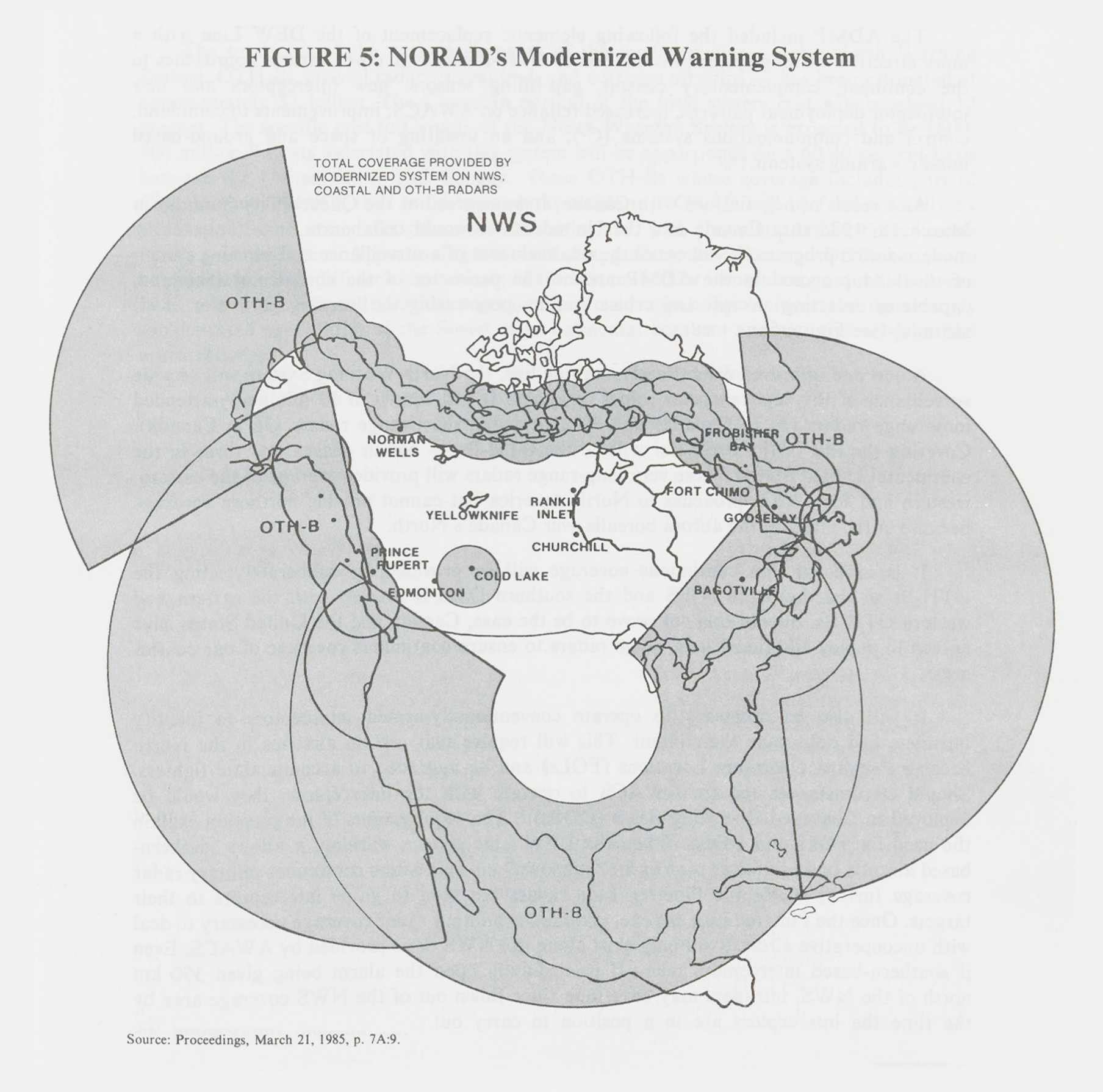 Figure 1: A map of North America showing the radar coverage of the 1985 plan to modernize NORAD’s surveillance system. OTHRs are used for surveillance in all directions but north, where the NorthWarning System’s ground-based radars are used.