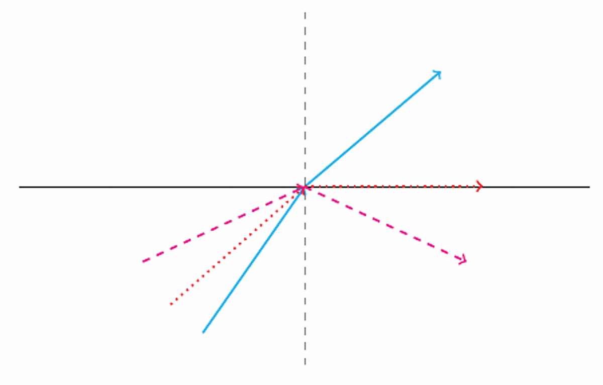 Figure 3: Illustrating refraction (solid blue line), the critical angle (red dotted line), and total internal reflection (magenta dashed line), for an electromagnetic wave traveling from a slower medium to a faster one.