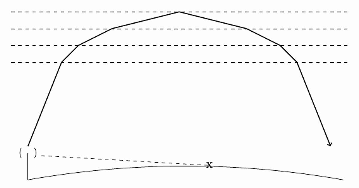 Figure 4: Illustrating skywave propagation via refraction through a toy ionosphere of distinct, homogeneous layers. The skywave is able to see far beyond the line-of-sight horizon of the radar.