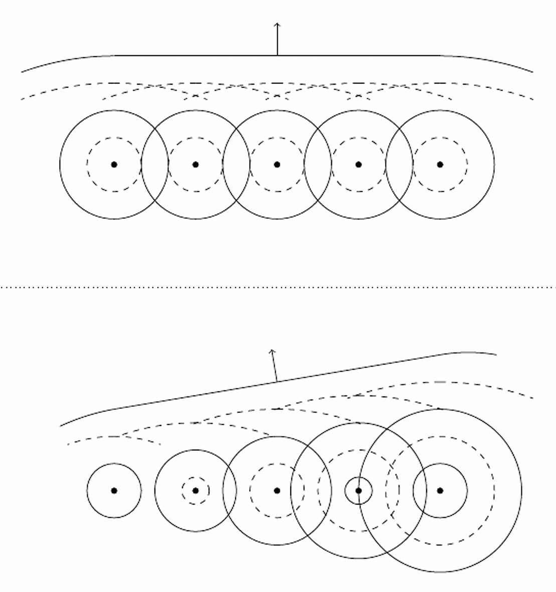 The second important concept is the beamforming of antenna arrays. The analogy here is to pebbles in a pond. A single pebble, when dropped in water, produces circular ripples emanating outward from the pebble. When multiple pebbles are dropped, however, the waves they produce undergo constructive and destructive interference, producing patterns far more complicated than any single pebble could produce. Antennas, like pebbles, produce waves with distinctive spatial patterns. When the outputs of many antennas are combined carefully, they too can produce cumulative patterns unlike anything a single antenna could do individually. Figure 5 provides an exaggerated illustration of a linear array of antennas (or pebbles) that individually produce waves uniformly in every direction. When all antennas are activated in lockstep, the net interference (at distances far from the array) is well approximated by a single wave propagating normal to the array; however, when the antennas emit waves with a slight offset, the direction of the cumulative wave is no longer normal to the array. Controlling the offset thereby controls the direction of the transmitted wave. Analogous processing can be done with a receiving array, enabling the radar to, for instance, substantially diminish returns (like interference or deliberate jamming) from certain directions.Footnote22