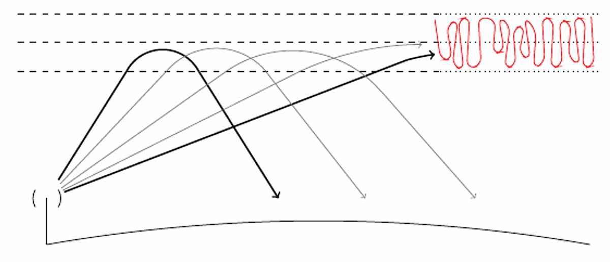 Figure 7: The broad beam of an OTHR can illuminate the ionospheric irregularities (red squiggle).