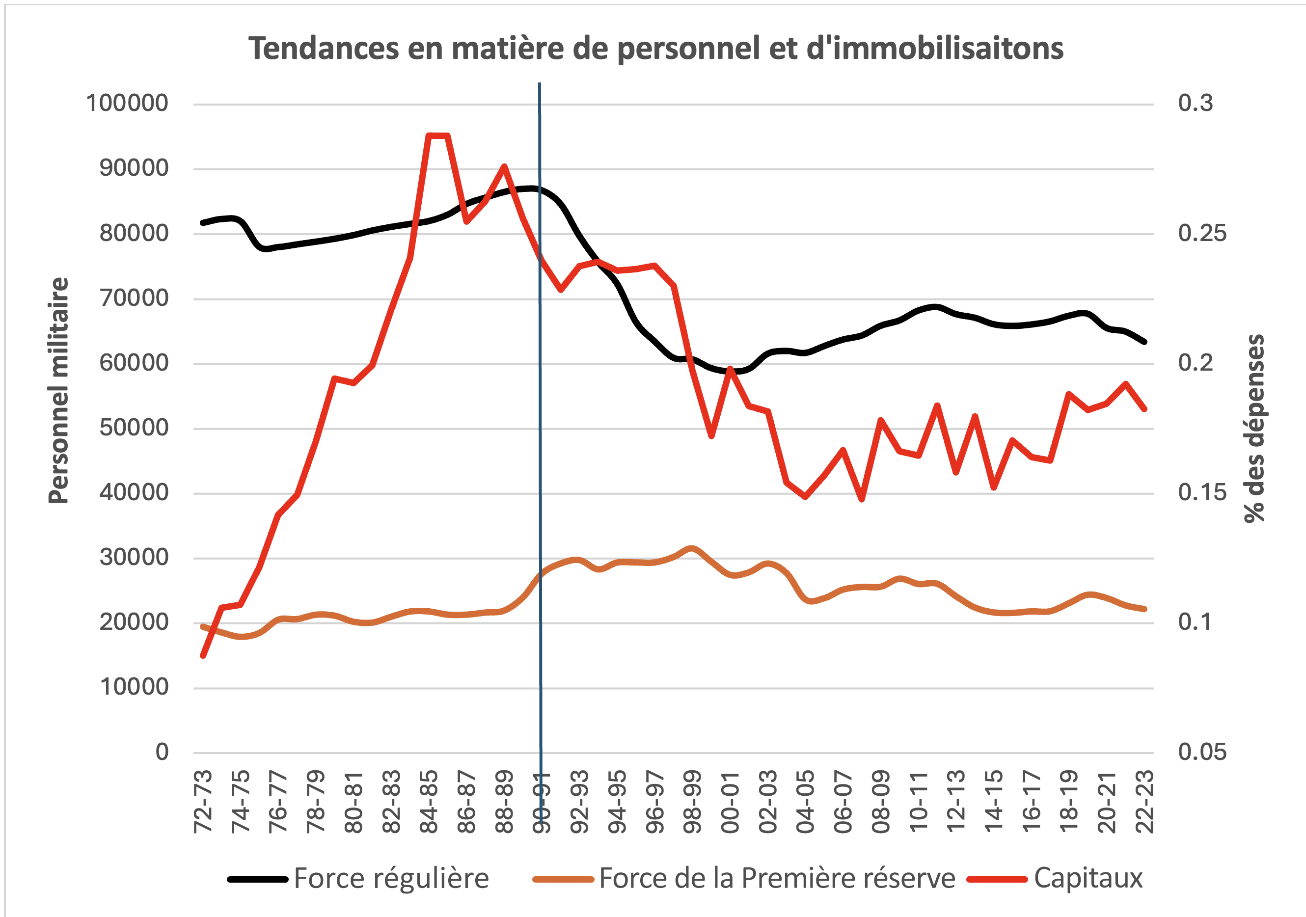 Une analyse ventilée des dépenses militaires—axée sur le personnel, les immobilisations et la recherche et le développement—peut fournir des indicateurs indirects de l’état de préparation militaire. Ces composants sont étroitement liés aux mesures des résultats, telles que les niveaux de forces déployables.Footnote34 La figure 3 montre l’évolution en matière d’effectifs et d’investissements en capitaux (en pourcentage des dépenses totales) de 1972-1973 à 2022-2023.