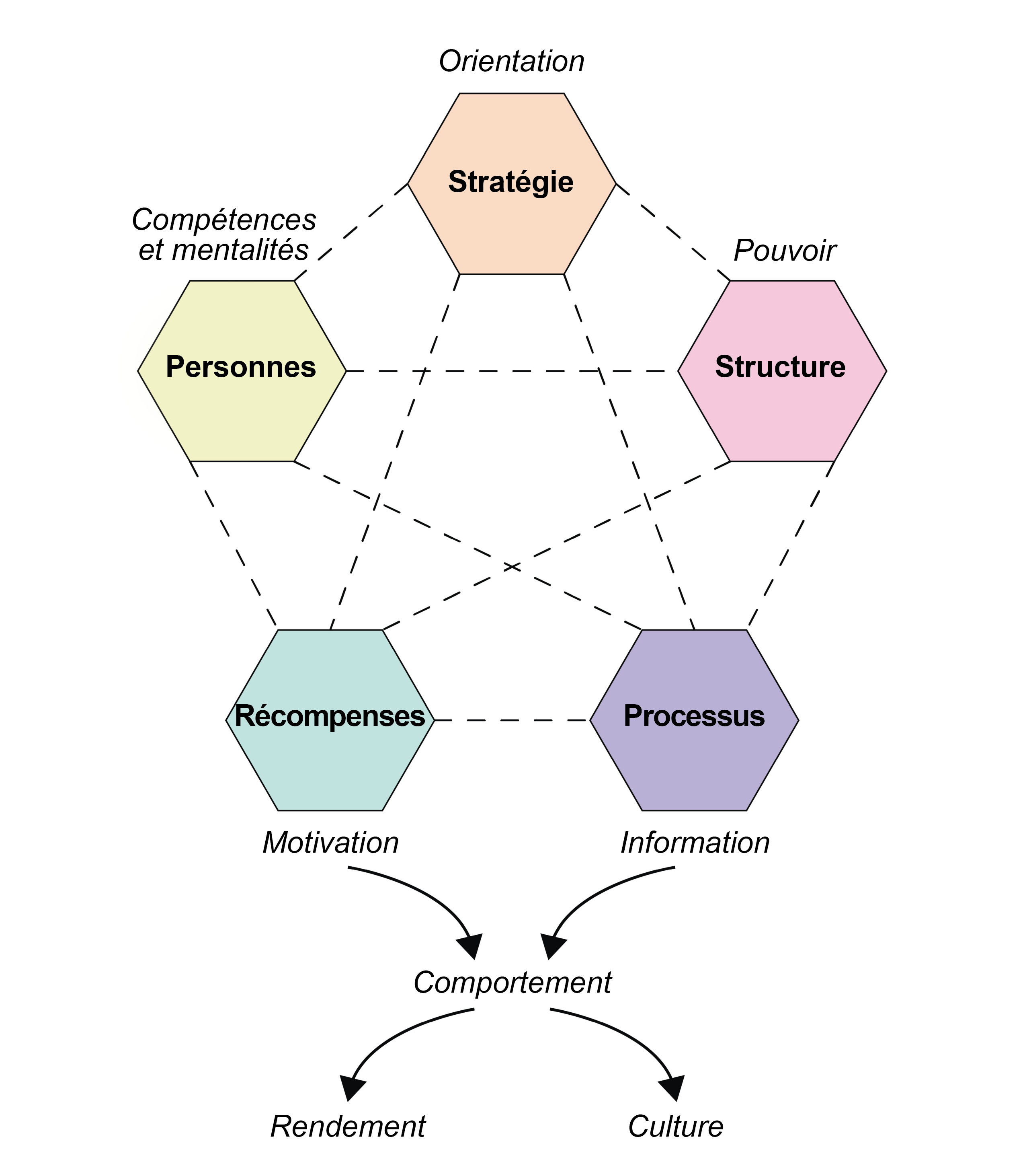 Comme l'illustre la figure 1, selon le modèle de Galbraith, les organisations seraient constituées de cinq composantes distinctes : la stratégie, la structure, les processus, les récompenses et les personnes. La stratégie « concerne les buts et objectifs à long terme (« ce que nous faisons ») ainsi que les plans d'action nécessaires pour les atteindre (« comment nous gagnons »). » [TCO]Footnote7 Elle donne une orientation au système. La structure est la configuration interne de l'organisation, qui détermine la façon dont les rôles et les activités sont divisés et attribués aux équipes, aux départements et aux divisions. Elle organise le pouvoir au sein du système par l'attribution de diverses autorités. Les systèmes de récompense sont les mécanismes qui visent à aligner les efforts d'équipe et le rendement individuel sur les objectifs de l'organisation, ainsi que les mesures utilisées pour mesurer ce rendement. De tels systèmes influent sur les motivations des actions au sein du système. Les pratiques axées sur les personnes font référence à l'embauche, au perfectionnement et à la promotion des bons talents pour mettre en œuvre et gérer avec succès le modèle organisationnel. Ces pratiques influencent les compétences et les mentalités disponibles au sein de l'organisation. Les processus font référence à la vaste gamme de procédures qui orientent la façon dont le travail est effectué et la façon dont les entités assurent la coordination, et englobent à la fois les processus verticaux tels que la planification, la budgétisation et la production de rapports, et les processus latéraux comme la coordination, l'alignement, la liaison et l'intégration. Ces processus déterminent la façon dont l'information circule au sein du système. Dans l'ensemble, la configuration de ces composantes internes produit des modes de comportement précis qui, à leur tour, deviennent caractéristiques de ce que l'on peut appeler le « rendement » et la « culture » de l'organisation.
