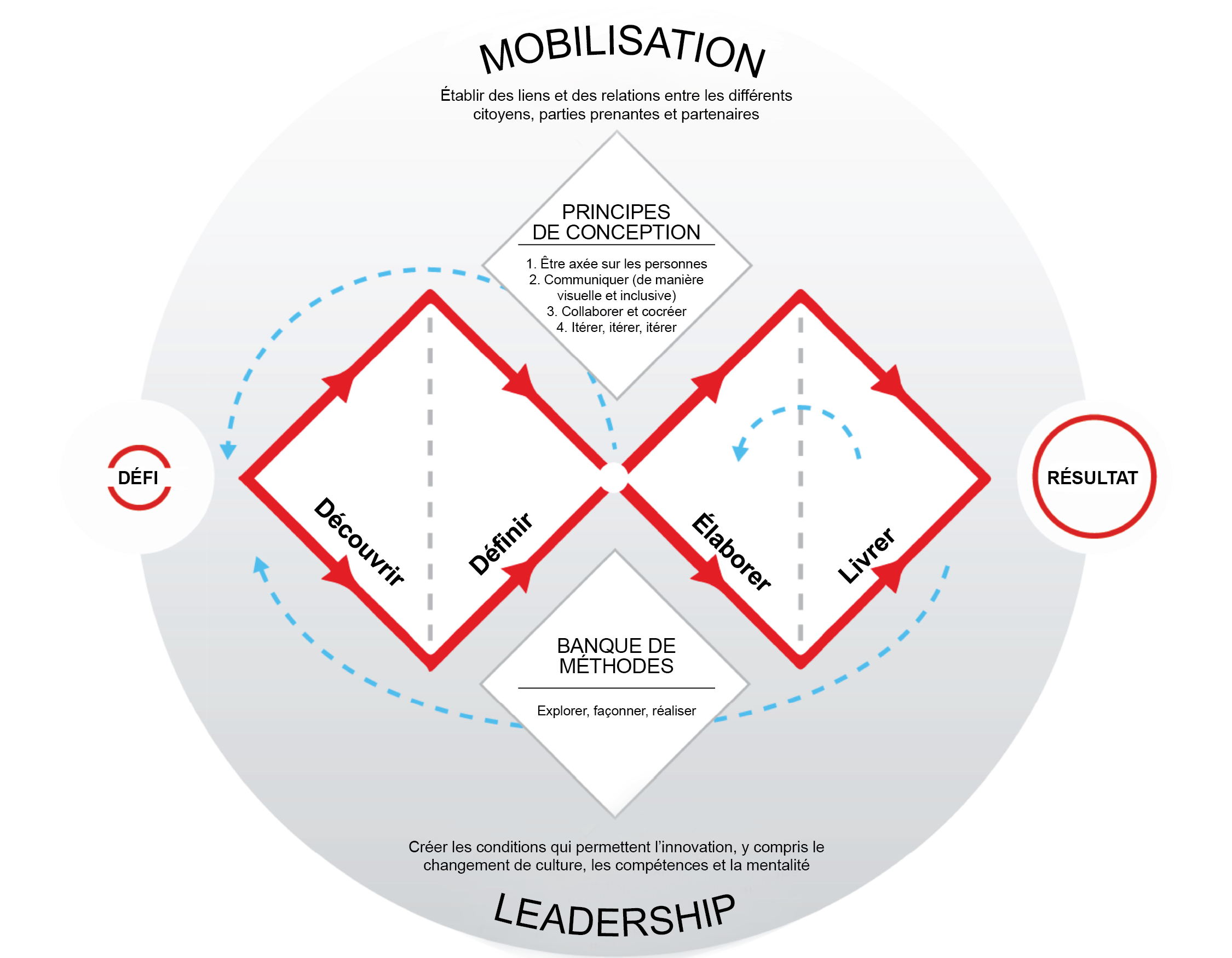 Le cadre pour l'innovation (« Framework for Innovation ») proposé par le Design Council est axé sur l'application d'un processus de conception en « double diamant » qui est maintenant largement référencé (voir la figure 2). Chaque diamant représente un processus d'exploration des questions en profondeur (visant à la divergence de pensée), puis de précision de la compréhension collective (visant la convergence de pensée) pour prendre des mesures ciblées. On applique premièrement le processus à la découverte et à la définition du « problème » (le premier diamant), puis au développement et à la livraison des « solutions » (le deuxième diamant). Bien que séquentiel, le processus comprend de nombreuses boucles de rétroaction, soulignant la nécessité d'une itération fréquente à chaque étape du processus pour parvenir à la clarté et au consensus.