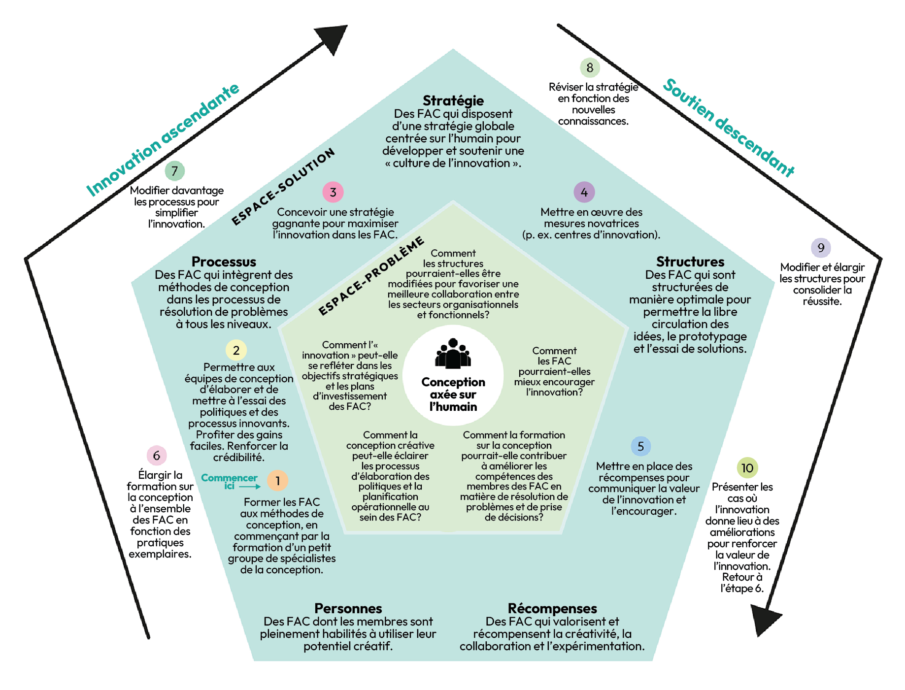 La transformation des FAC en une organisation véritablement innovante, qui adopte une culture de l'innovation, est une aspiration louable qui nécessite un examen complet des stratégies, des structures, des processus, des politiques axées sur les personnes et des systèmes de récompense de l'organisation. Il s'agit d'une entreprise qui nécessiterait à la fois un leadership descendant et une mobilisation ascendante. Elle nécessiterait une prise de risques, un tâtonnement, une collaboration et une volonté d'expérimenter. Elle exigerait de mieux comprendre les obstacles actuels à l'innovation (c.-à-d. l'espace-problème) et les moyens potentiels de les éliminer (c.-à-d. l'espace-solution). De plus, elle nécessiterait des investissements d'avant-garde dans des activités d'exploration qui ne mèneront pas toutes à des résultats immédiats. Compte tenu de ces réalités, il est avantageux d'envisager l'objectif de favoriser une culture de l'innovation dans les FAC sous l'angle d'un défi de conception continu à relever au moyen d'interventions de conception continues et structurées, guidées par une méthodologie de conception créative.