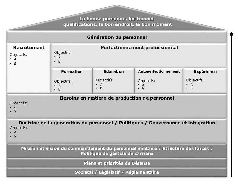 La GENPERSMIL reste responsable du recrutement, de l'instruction et de l'éducation.Footnote29 Conformément au processus d'élaboration d'un CMR, la première étape consistait à élaborer le schéma stratégique du CMR de la GENPERSMIL.Footnote30 Celle-ci a été réalisée à l'aide de documents stratégiques clésFootnote31 et de l'expertise de membres supérieurs de l'état-major bien informés.